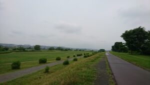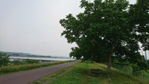 土手に出て、上流方面を見ると。 いつもの散歩道。。