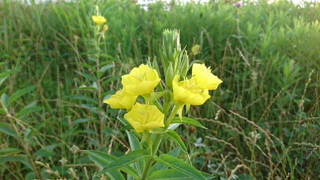 調べたら、夕暮れを待って咲き、朝には閉じる花との事。「待宵草」聞いた事があります。昨日のハルシャギクの鮮やかな黄色に比べ、何とも優しい黄色です。