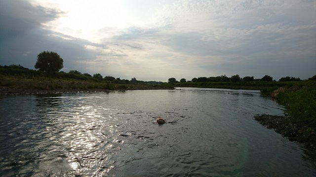 今日は下流方面を見て。 愛犬を連れて川へ。どこからか大きなボールをくわえてきて、朝陽の隣を泳いでいます。この後、大粒の雨が降ってきて、しっかり濡れて、開き直って一緒に川に入って遊びました。朝から全開です。