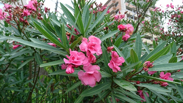 車の走っている道路沿いや建物の間等でもよく見かけます。夏がよく似合う花、キョウチクトウ。