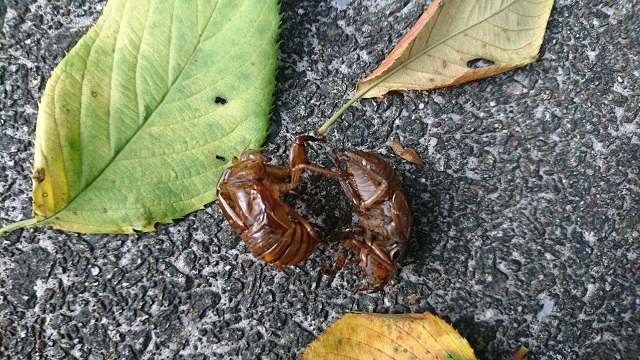 歩道に、セミの抜け殻。今年初めて見つけました。 見上げれば大きな桜の木があり、ジージー、ジージーと鳴いています。夏を耳でも感じました。抜け殻を手に取り、孫の喜ぶ顔と、娘の怒った顔が浮かんできて、、、置いてきました。。
