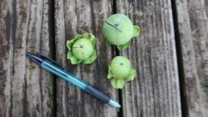 昨日からの雨で落ちていました。ペンと比べても小さい小さい。 でも、ちゃんと柿の形をしています。