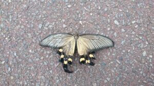 ジャコウアゲハ と言うようです。今朝、多摩川のサイクリングロードにいました。 アスファルトの上に羽を羽を拡げたまま動かない。近くにスズメ。一度通り過ぎたのですが、どうしても気になって、、。戻って覗き込むと、触覚が少し動い […]