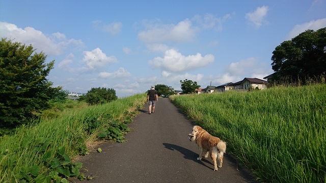 これは、休日朝、川で一泳ぎ(犬が)をした帰り道、土手への坂を登っているフタリ。
