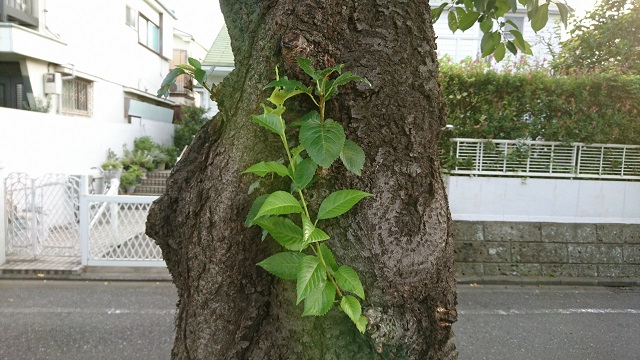 今朝 歩道を走っていたら、古い桜の木の幹に、新しい小枝を発見。