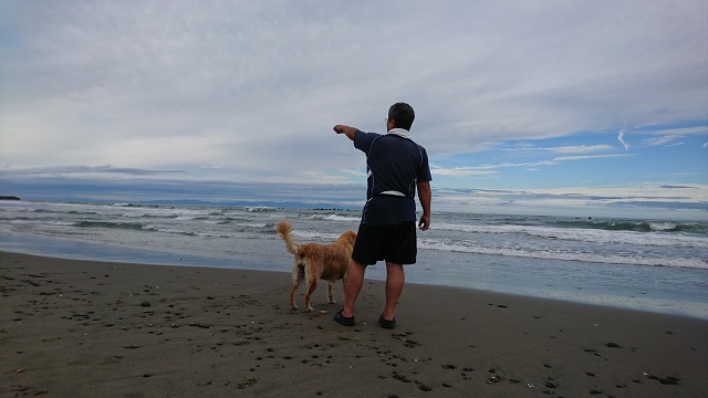 日曜日、静岡の海です。小山と愛犬なずな。