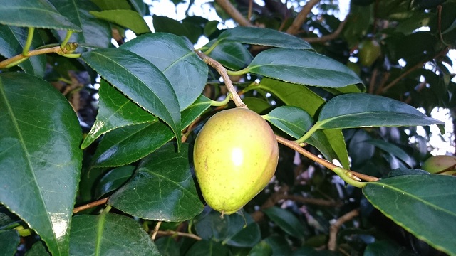 事務所の隣の公園に生っています。まだ少し青い椿の実。