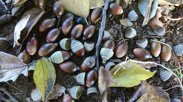 場所は神代公園。強風の中、公園の横を自転車で走っていたら何かか当たって、、道路を見ると枯葉と一緒に小さなドングリが落ちていました。小指の先より もっと小さい1㎝ちょっと。でも立派に袴をはいています。嬉しくなって自転車を止めて、ドングリの木の下まで行って、撮った写真がこれ。今、ポケットの中に4粒のドングリ。孫達へのお土産です。。