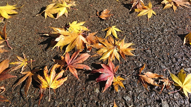 昨日 研修会からの帰り道、午後1時頃の写真です。午前中の雨から一気に日射しがでて、少し戸惑っているモミジ達。