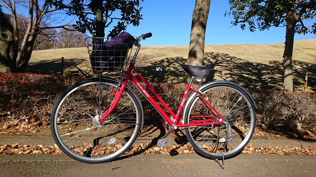 えへ、新しい自転車です。27インチ、赤、軽量。