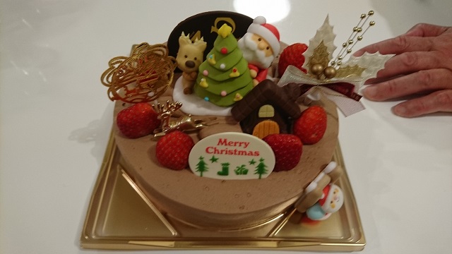 総勢10名。5才~もうじき1才までのチビ達4人、いや スゴイの何のって、食べ物やオモチャを争っての泣き、数知れずでした。写真は、今年のクリスマスケーキ。とても美味しかったです。娘達が小さかった頃、クリスマスの夜、小山が都心で買ってきてくれるケーキを皆で待ちわびた思い出があります。懐かしいなあ。さて、右上に手が置かれていますが、この別テーブルに置かれたケーキを 4人の外敵から守っている、小山の手です。無造作に置かれているようですが、少し膨らんだ指先に何故か緊張感が伝わってきます。小山ジージ、大事なお役目、ご苦労様でした。