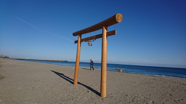 砂浜に出たら、鳥居が建っていました。鳥居の真ん中に小山。小山を追いかける犬。いつもどおりの光景です。