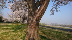 桜の幹です。満開の桜に負けない位、綺麗な横縞です。 ここ稲城の桜は、若い樹が多くて、花にも幹にも勢いが感じられます。花は細い枝の先にまで花が付き、幹はツヤツヤと朝日に光っています。事務所隣の公園の桜は老木で、幹は黒くゴツ […]