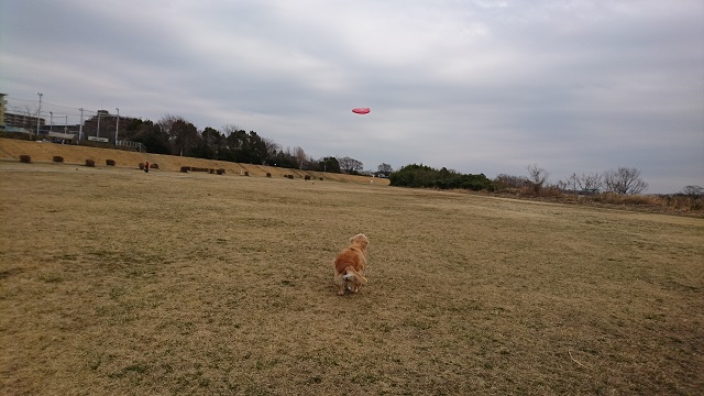 犬が前向きに走っている、という事ではありません。走るのが あまり得意でない肥満気味のゴールデンが、フリスビーを真剣に追いかけるのです。そして、かなりの確率でキャッチします。落としても何度も何度も挑戦します。一回ごと、お腹を地面に付けて休憩するのですが、暫くすると立ち上がって、咥えているフリスビーを私や小山の足元に置きます。そして、また走り出します。諦めず挑戦する愛犬の後ろ姿に 学ぶ事もあります。