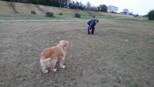 曇り空の下、小山と犬が、草むらでボールを見つけて、ボール遊びを始めました。ボールはかなり汚れていて、小山が投げる前に泥を落としている、その時の一枚かと。実はこの写真、結構「タメ」の時間があって、小山は中腰のまま 右手だけが動いていて、犬は シッポが変な角度に曲がったまま止まっていて、ここだけ、少し緊張感が感じられました。大した緊張感ではありません。 おふたりさん、どちらも安定感があると言うか 貫禄があると言うか、今 雪が降ったら 確実におふたりの背中にはヒト並み以上の雪が積もるわけで、、。何とかせにゃ と。 あっ、この続きは、これから犬ブログの方に書く予定ですので、よかったら覗いてみて下さい。宜しくです。
