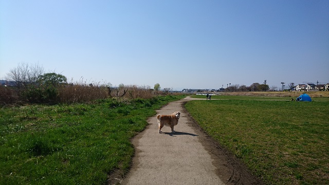 左側が多摩川。犬が川に行ってもいいか、こちらを見ています。