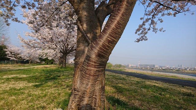ここ稲城の桜は、若い樹が多くて、花にも幹にも勢いが感じられます。花は細い枝の先にまで花が付き、幹はツヤツヤと朝日に光っています。事務所隣の公園の桜は老木で、幹は黒くゴツゴツとしています。これはこれでいい味を出してくれているのですが、若い幹の「頑張るぞ」的な感じに比べて、「頑張って」と声を掛けたくなる感じで、、。今日は外を歩いていて、何度も桜吹雪にあいました。道路が花びらで白くなっている所も多くありました。上を見たり、下を見たり、花びらを追いかけたり、疲れました。。