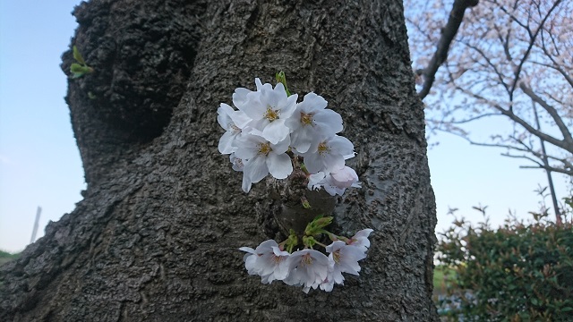 先週水戸に行った時のこと、、古い桜の木の下に、桜発見。