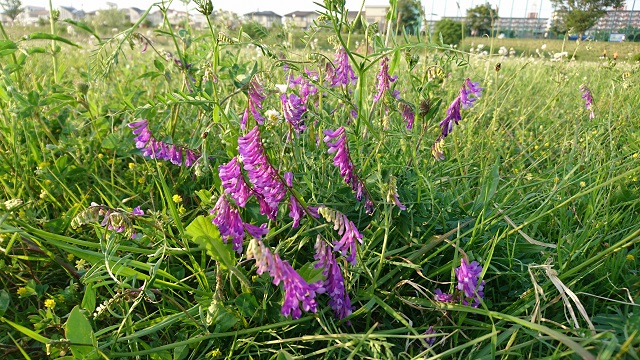 ナヨクサフジと言うそうです。今、多摩川では あちこちでこの赤紫の花を見かけます。