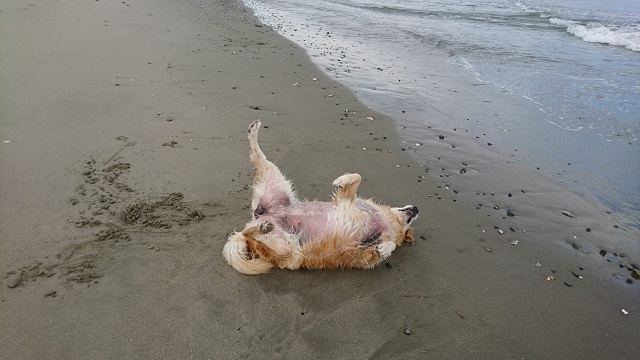 いつも海で遊んだ後、サーフィンショップnattyでシャワーを借りるのですが、この日着いたのは夕方で、お店は閉まっていました。帰りの事を考え、小山が犬に「汚していいのは足だけだぞ」と何度も言い聞かせていたのですが、あっという間にひっくり返り、この状態。