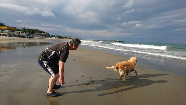 このフタリ、実に動きに無駄がなくて、、。犬は、小山が少し下を見て膝を曲げ始めた時点でダッシュをかけます。小山は、犬が置いて行ったボールを手に取り、走り出した犬の方向、速さに合わせ、なおかつ波の割れ目を避けて、投げます。これが上手い。この日は、波がいつもより大きかったのですが、白波に呑まれることなく、犬の走る先の的確な位置にボールを落としていきます。私の頭の中は「道のり=速さ×時間」という公式が浮かんできて、こんな時に使うのかなあ、と。 小山に聞いたら、「感覚だ。愛情だ。」とでも言うのでしょうか。重なり合ったフタリの影が、これまた楽しそうで、、。