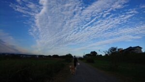早朝、多摩川に行ったら、空がこんな感じ。すごい。秋の空、どこまでも高く感じます。 フタリが私を呼んでいます。「は~い、今、行きますよぉ。」