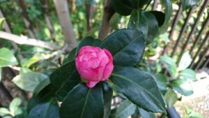 で、これは、地面近くにあった、まだ固い山茶花の蕾。 北側で低いだけに、上よりもっと陽が当たらない。厚めの葉っぱに支えられて、頑張れ、蕾。