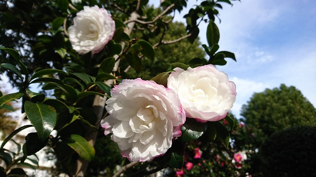 この間の山茶花とは別の木。我が家の北側にある木です。 早朝、青空と公園の寒椿をバックに、淡い白色の花びらが何とも優しくて、、 南側に植え替えようと思ったけど、しっかり根を張って、沢山の花を咲かせてる。すごいなあ。すごいよ。