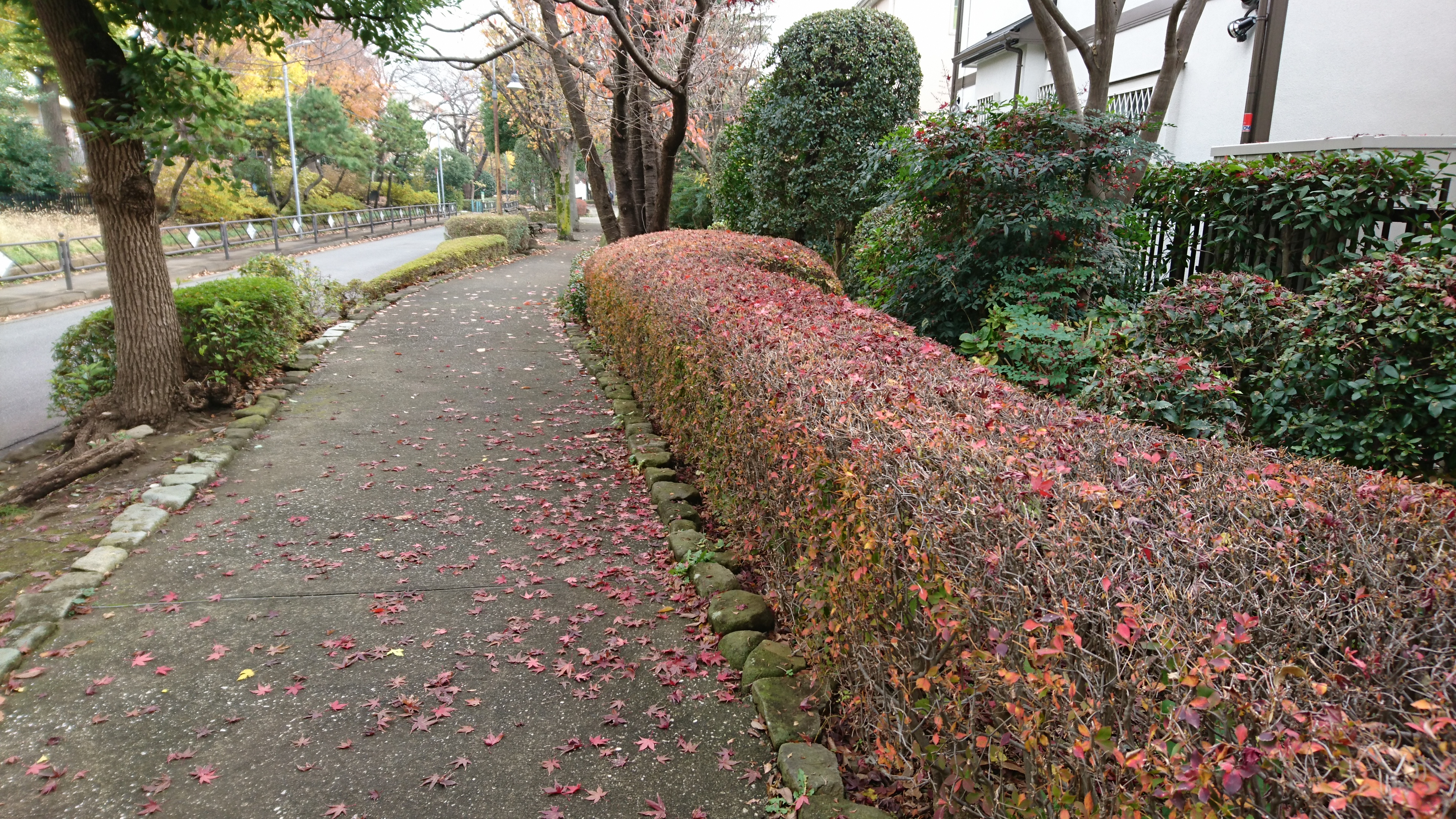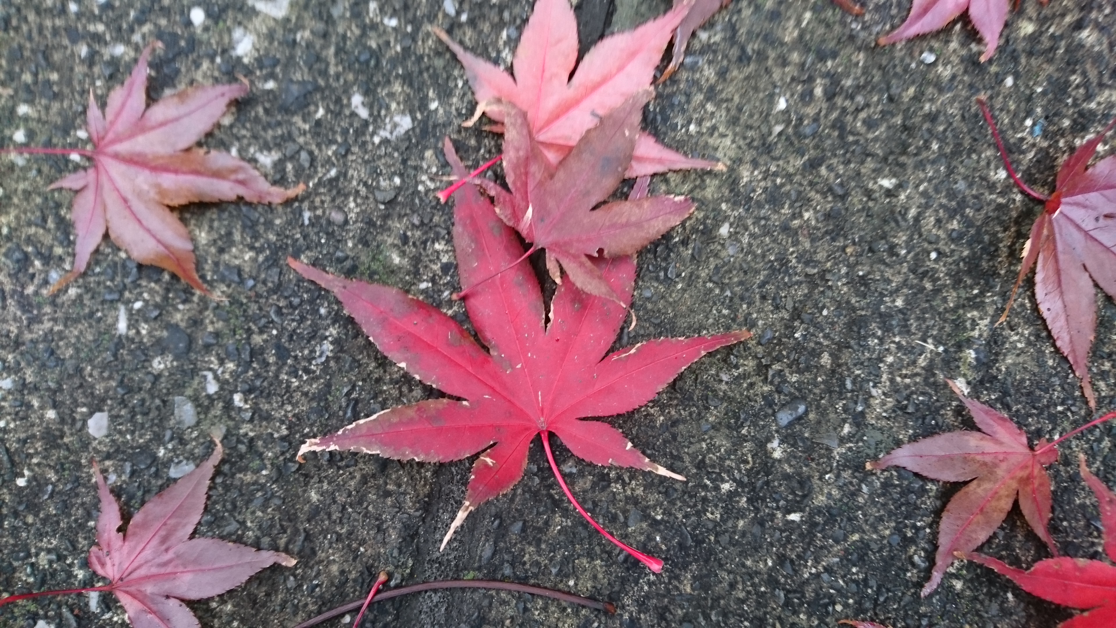 昨日の雨で少し傷んだ紅葉が、散歩道に落ちています。