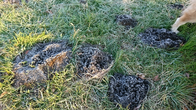 早朝の多摩川。土手の下、モグラの穴に霜柱が立っていました。