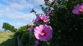 先週始め、多摩川の土手沿いに咲いていました。ムクゲです。 この花も夏を代表する花の一つかと思います。日差しの強い朝だったのですが、皆、下を向くことなく…