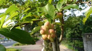 武蔵境近くに出掛けた帰り道、境通りの並木道でこんな実を発見。 可愛らしい桃色掛かったビー玉位の実が結合している感じで、何ともユーモラスな形をしています…