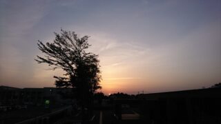 一昨日、義父の新しい「部屋」から見えた夕日です。中央少し下、太陽が沈みかかっています。 帰ろうとカーテンを閉める時に思わず撮った一枚です。本当は太陽が…