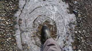 犬の散歩に行こうとしたら、道端の水溜まりが凍っていました。 大きな鏡のような氷の真ん中に、足を乗せて踏み付けたら、ミシッと音がして 円を描くように割れ…