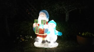 なんと、事務所の道路に面した花壇にサンタです。スノーマンも一緒です。 何か、夢がありますね。クリスマス迄は、夜は門灯も消して、フタリには思い切り主役に…