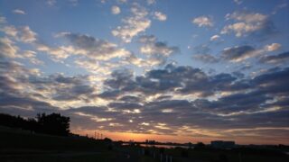 今朝の多摩川。見事な朝焼けです。 西方向に走っていたら、何か背中が落ち着かなくて、振り返ったら、この光景。いつもだったら、一旦止まって写真を撮るのです…