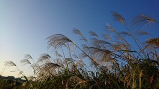 今朝の多摩川。濁流で周りは皆倒れているのに、これらだけは頑張っていました。 敬意を表して 思わず一枚。朝日と青空、いい具合にきれいです。実はこのすすき…