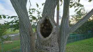 胡桃の木です。この木の下でも実を拾いました。 幹の下ばかり見ていたのですが、顔を上げたら、幹がバンザイして「ヤッホー」と言っていました。ウソです。でも…
