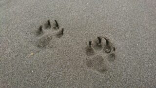 波の引いた砂浜に残った、愛犬の肉球です。実はデカイ。 ブログにも登場しますが、ゴールデンレトリーバー 体重は50キロ近くあります。肉球の大きさ、砂ばか…