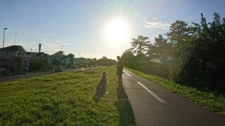 今朝の小山と愛犬なずな。朝日がきれいです。 毎朝 土手に出ると、小山達は東(下流方向)に、私は西(上流方向)に向かいます。でも今朝は朝日が気持ちよくて…