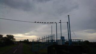 多摩川の鳩達。今朝は風が強くて、皆きれいに同じ方向を見ています。 鳩達、南方向だけどちょっと斜め西見てる。だから今日は、南南西の風。本当は電線の左側に…
