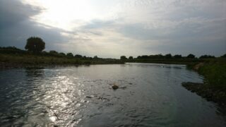 今日は下流方面を見て。 愛犬を連れて川へ。どこからか大きなボールをくわえてきて、朝陽の隣を泳いでいます。この後、大粒の雨が降ってきて、しっかり濡れて、…