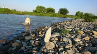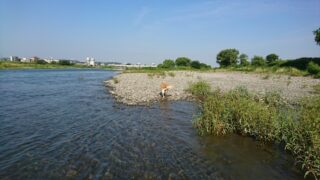 河原の中で、犬が私の足にしっかりと乗っています。 なぜ、浅瀬で背筋を伸ばして、私に くっついているかと言うと、、   ここからは、昨日の続き…